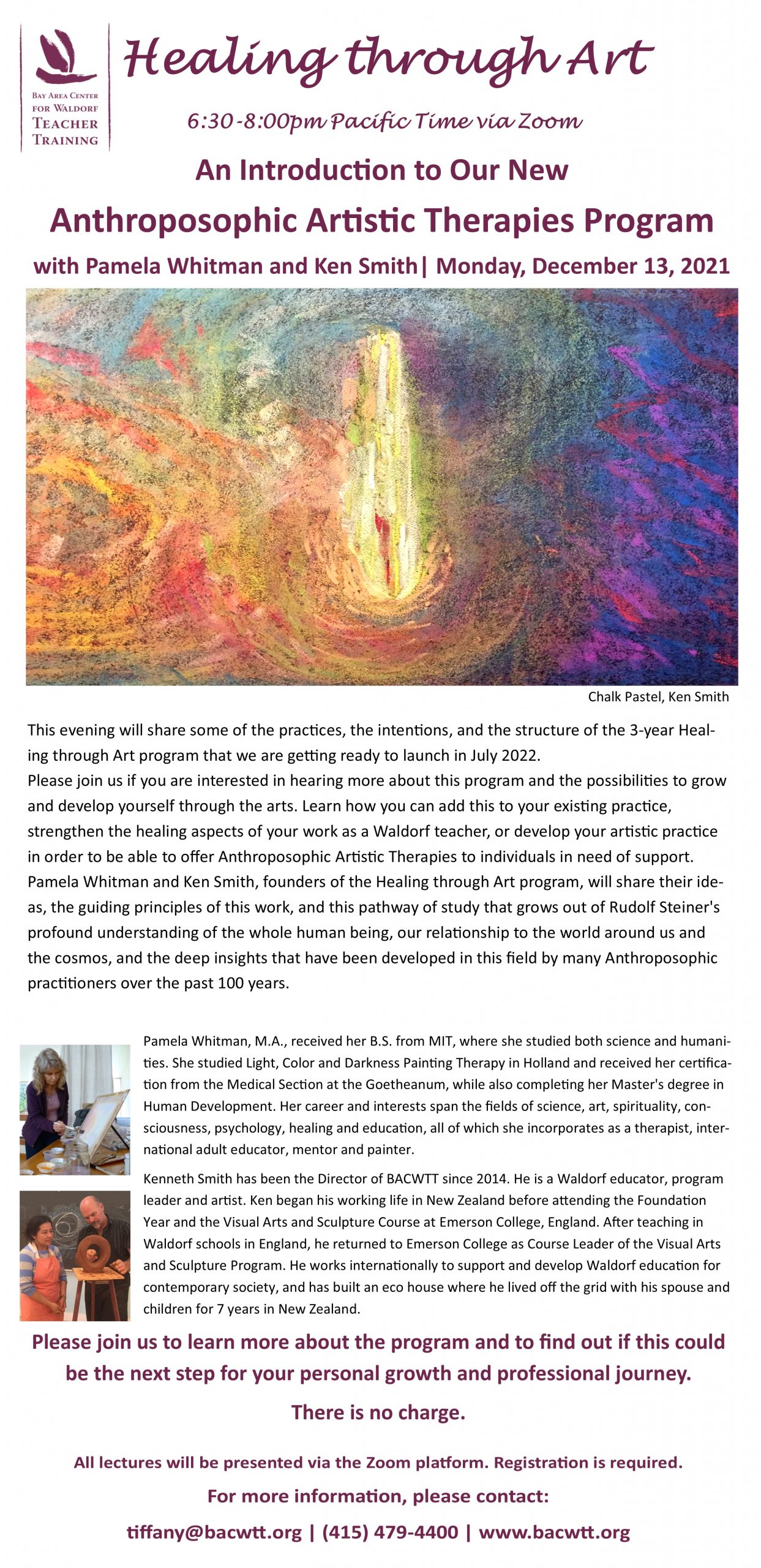 Experience guided color and a sculptural activities. Reflect upon the sense impressions of the colors and forms, as well as the experience of the activity, and explore how this can be led into a healing process. We will have time for questions about the three-year Healing Through Art program.