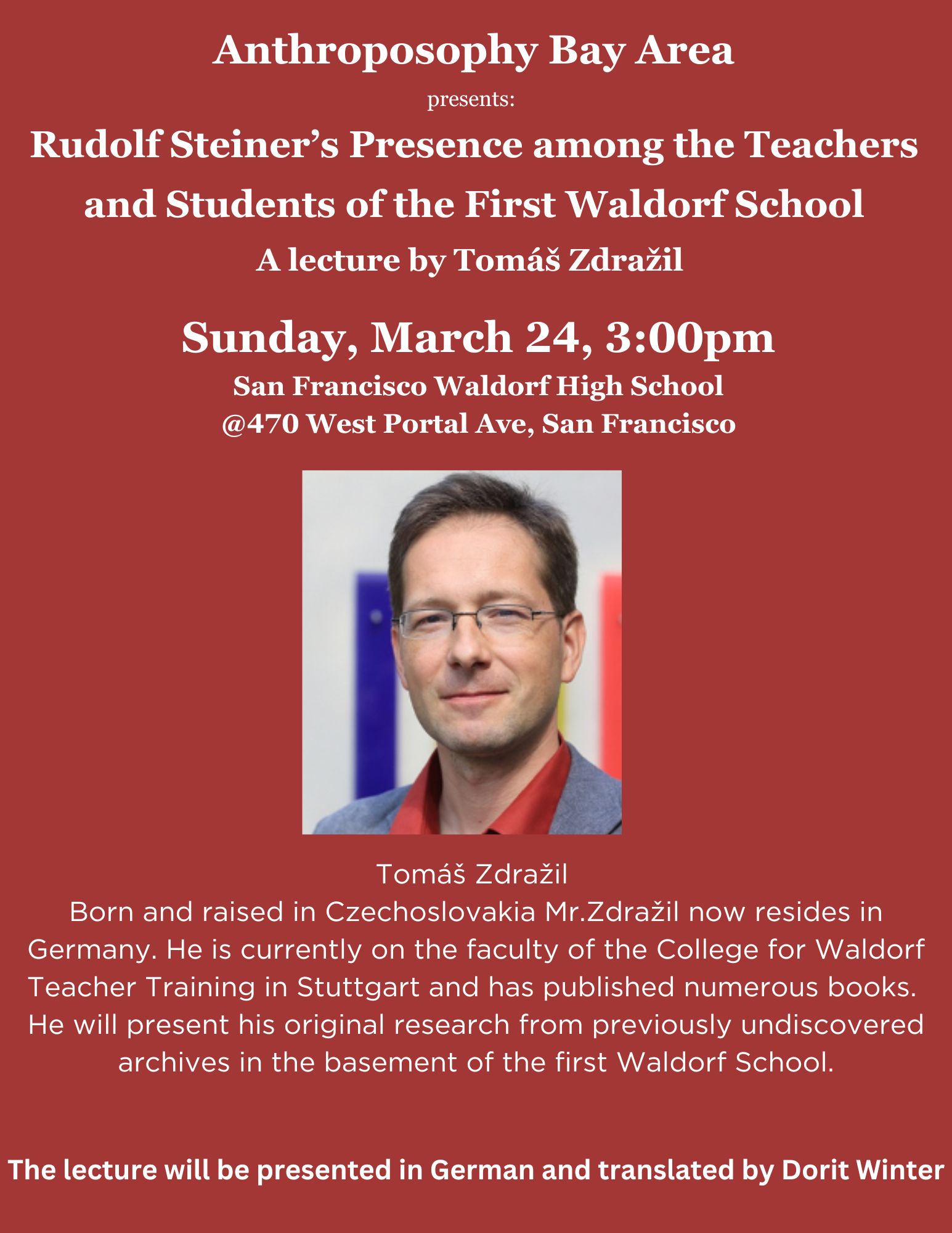 Please join us for the unusual opportunity in hearing Tomas Zdrazil present from his original research into the beginnings of Waldorf education. He is currently on the faculty of the College for Waldorf Teacher Training in Stuttgart. Mr. Zdražil has published several books and his most recent one is based on findings of undiscovered archives in the basement of the first Waldorf School. He will introduce and guide us toward an understanding of Rudolf Steiner’s work and relationship to the teachers and students at the school.